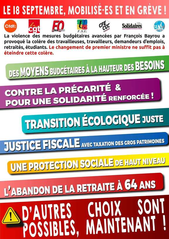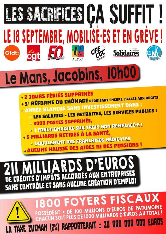 Nos organisations appellent à une journée de mobilisation le 18 septembre 2025 à 10h, Place des Jacobins au Mans, par la grève et la manifestation. Le musée des horreurs du projet de budget doit être abandonné. Les exigences sociales doivent être enfin prises en compte ! Nous voulons :